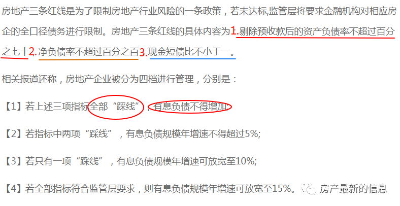 房地产行业的杠杆比例大,很多时候都是“拆东墙补西墙”。“三条红线”对于房企的限制性很大。如果3条都过线,那么开发商几乎没了再贷款的资格,资金流出现问题后首先要做的就是降价出售房屋,度过难关。